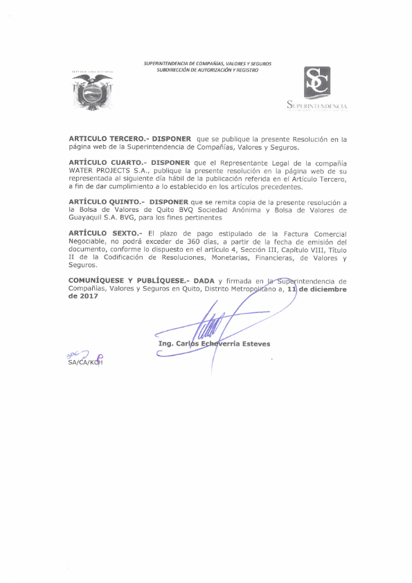 Resolución de aprobación de emisor y la emisión de Water Projects S.A.